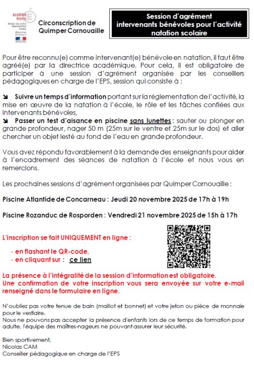 > jeudi 20 novembre 17h-19h à l'espace aquatique Atlantide de Concarneau.
